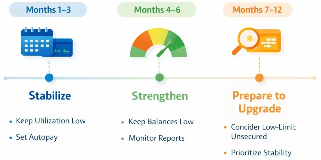 Use one secured card, keep utilization low, and set autopay. Avoid new credit applications.